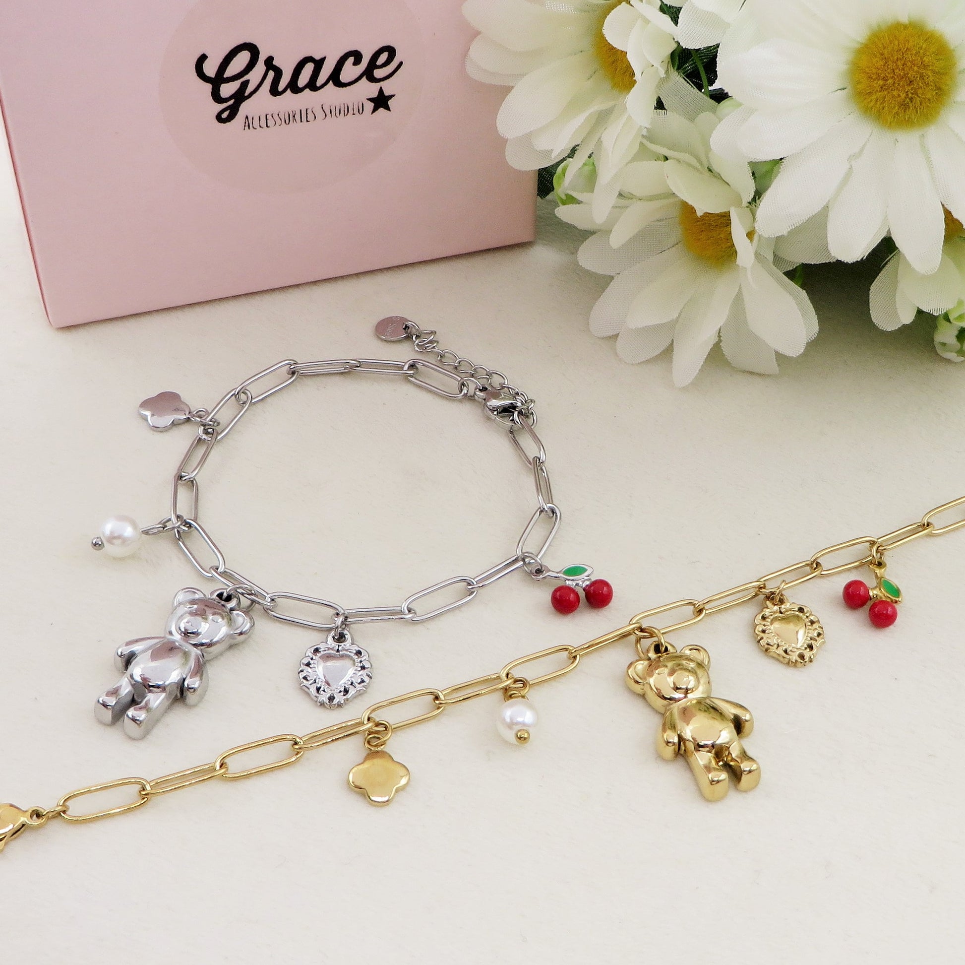 CHERRY TEDDY - ACCIAIO inossidabile - Bracciale catena charms orsetto, ciligie, cuore sacro