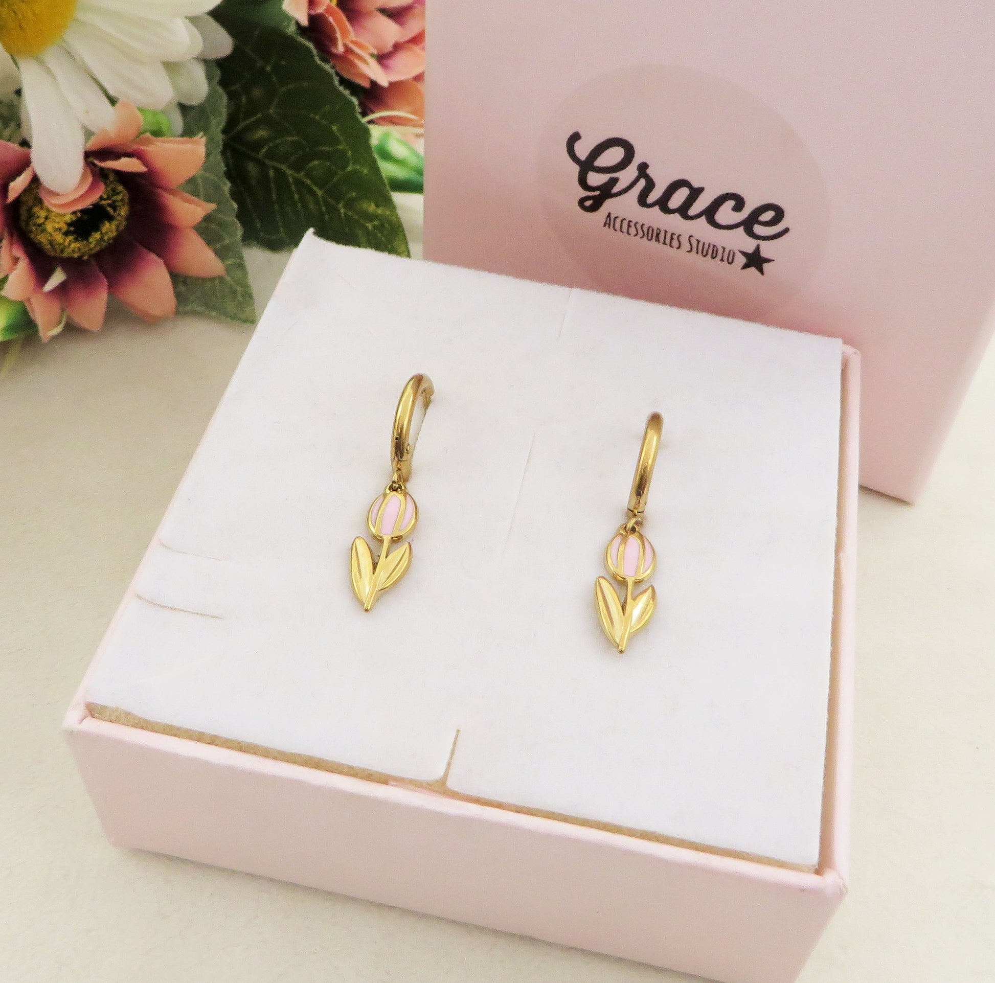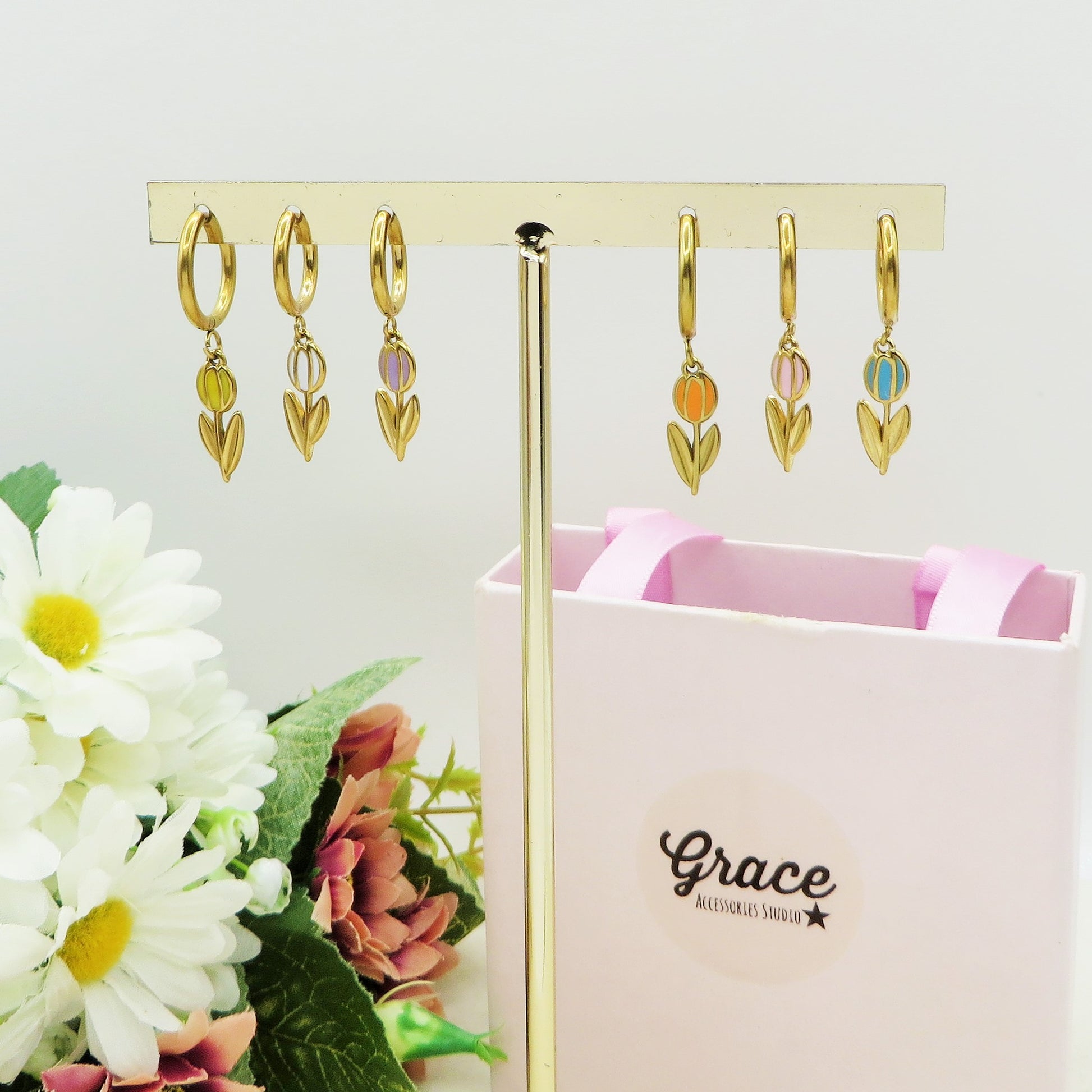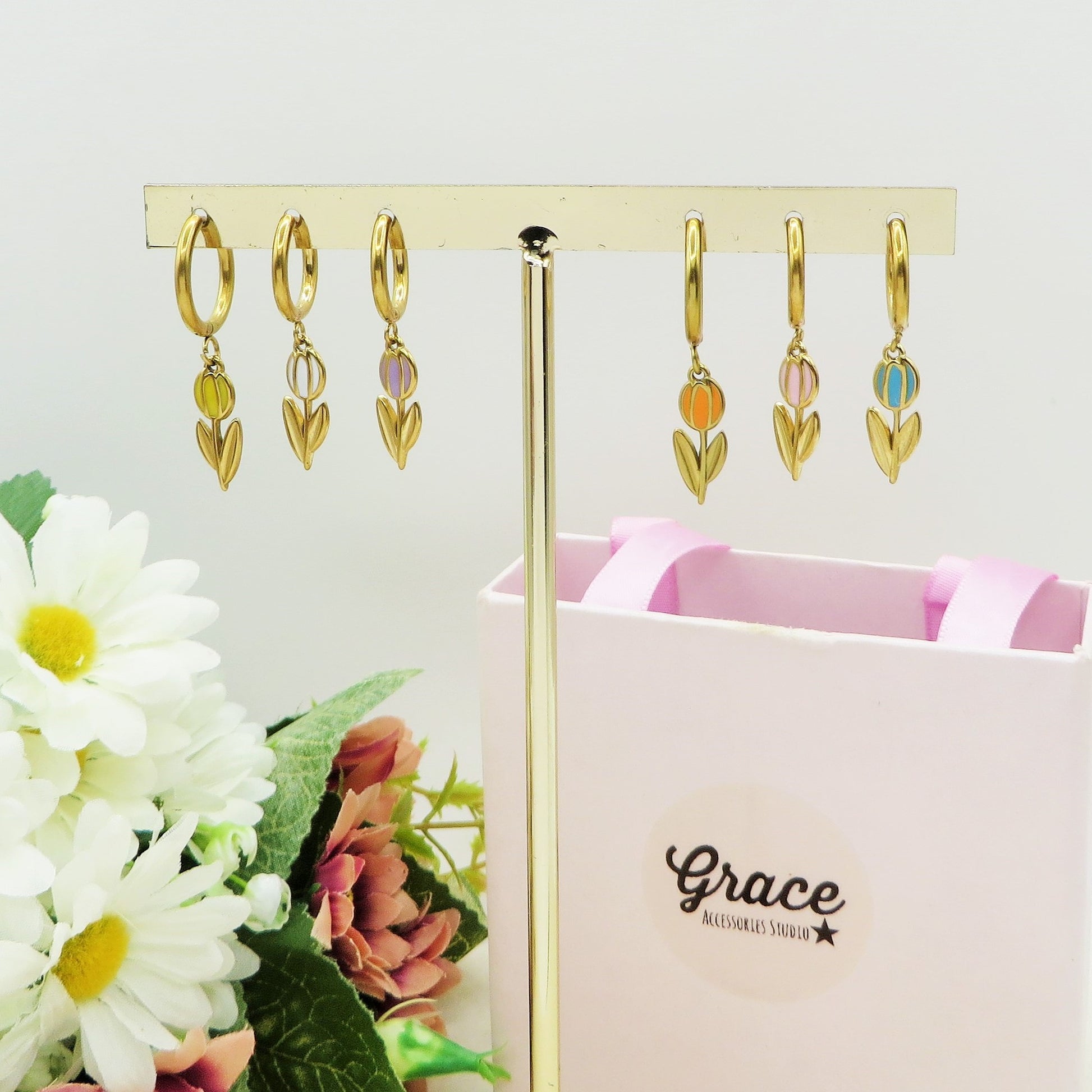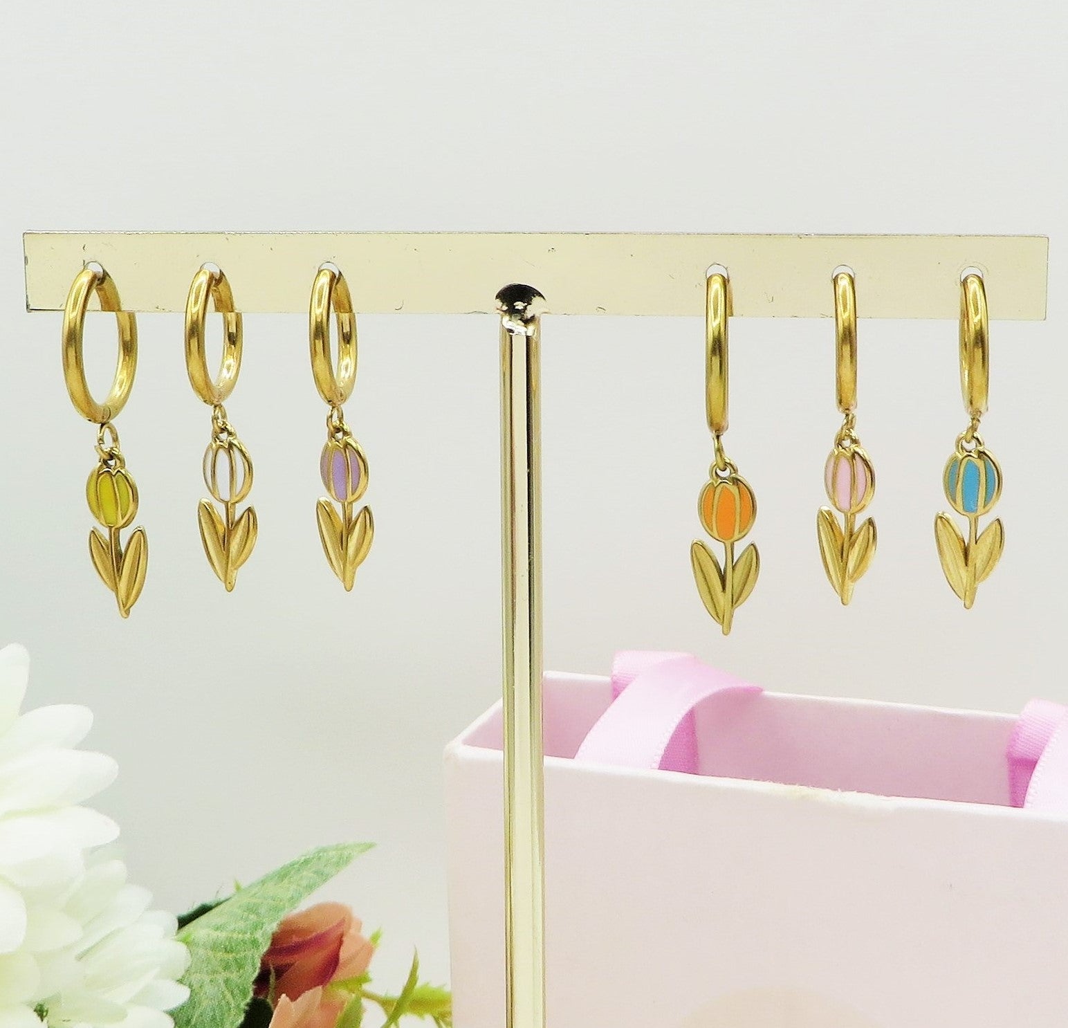 TULIP - ACCIAIO INOSSIDABILE - Paio Orecchini hoops pendenti con tulipano smaltato