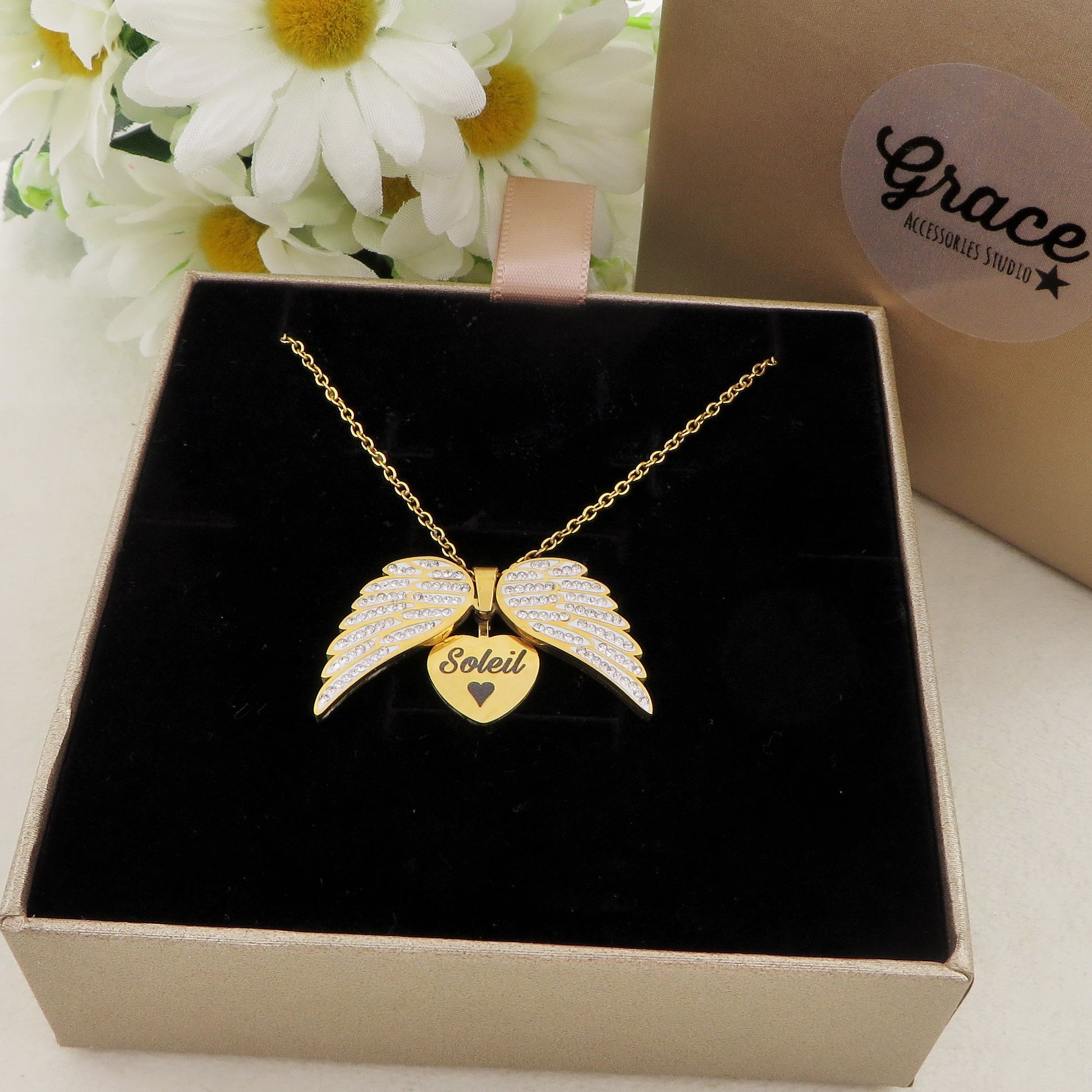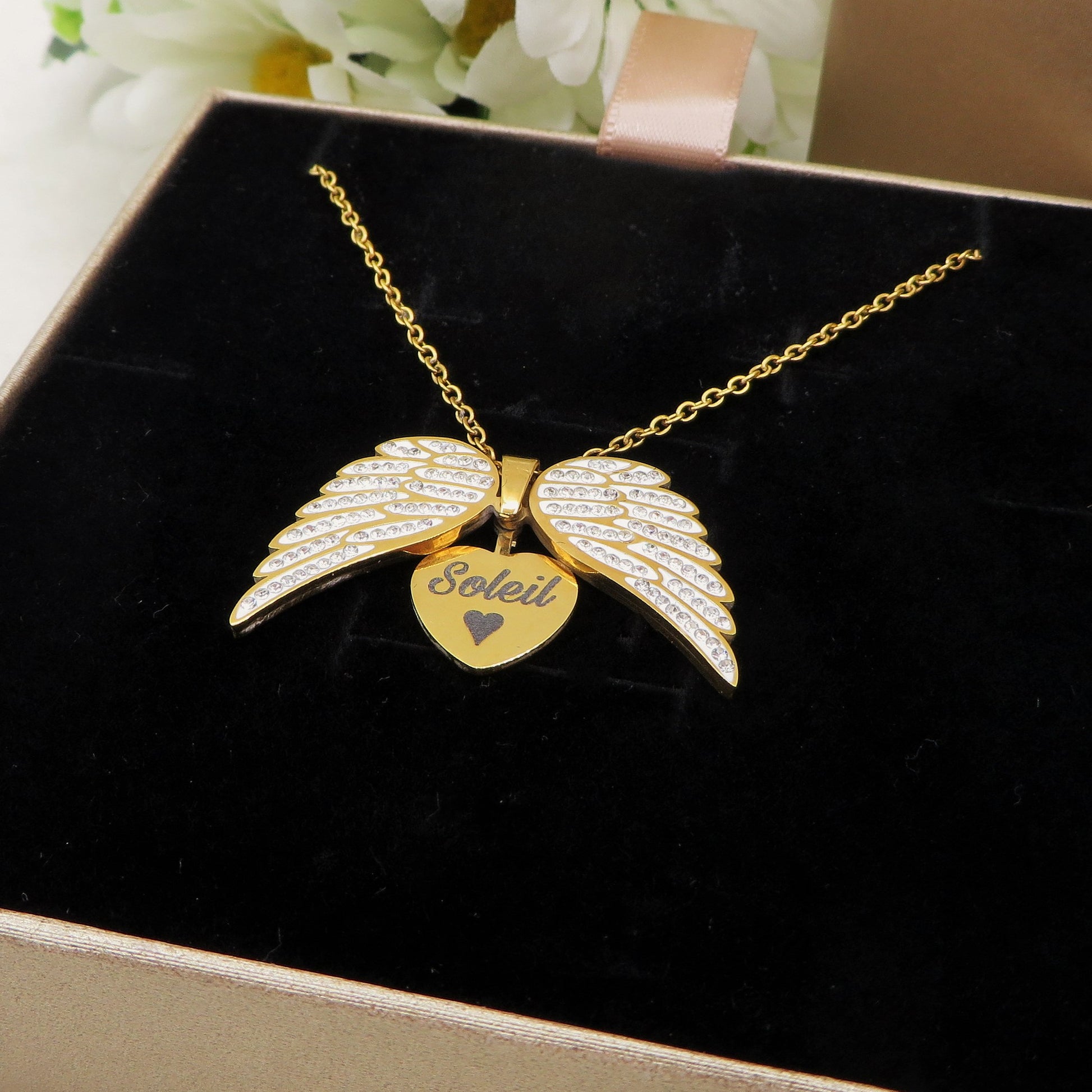ANGEL HEART ~ ACCIAIO inossidabile - Collana ciondolo ali zirconate apribili con incisione PERSONALIZZATA
