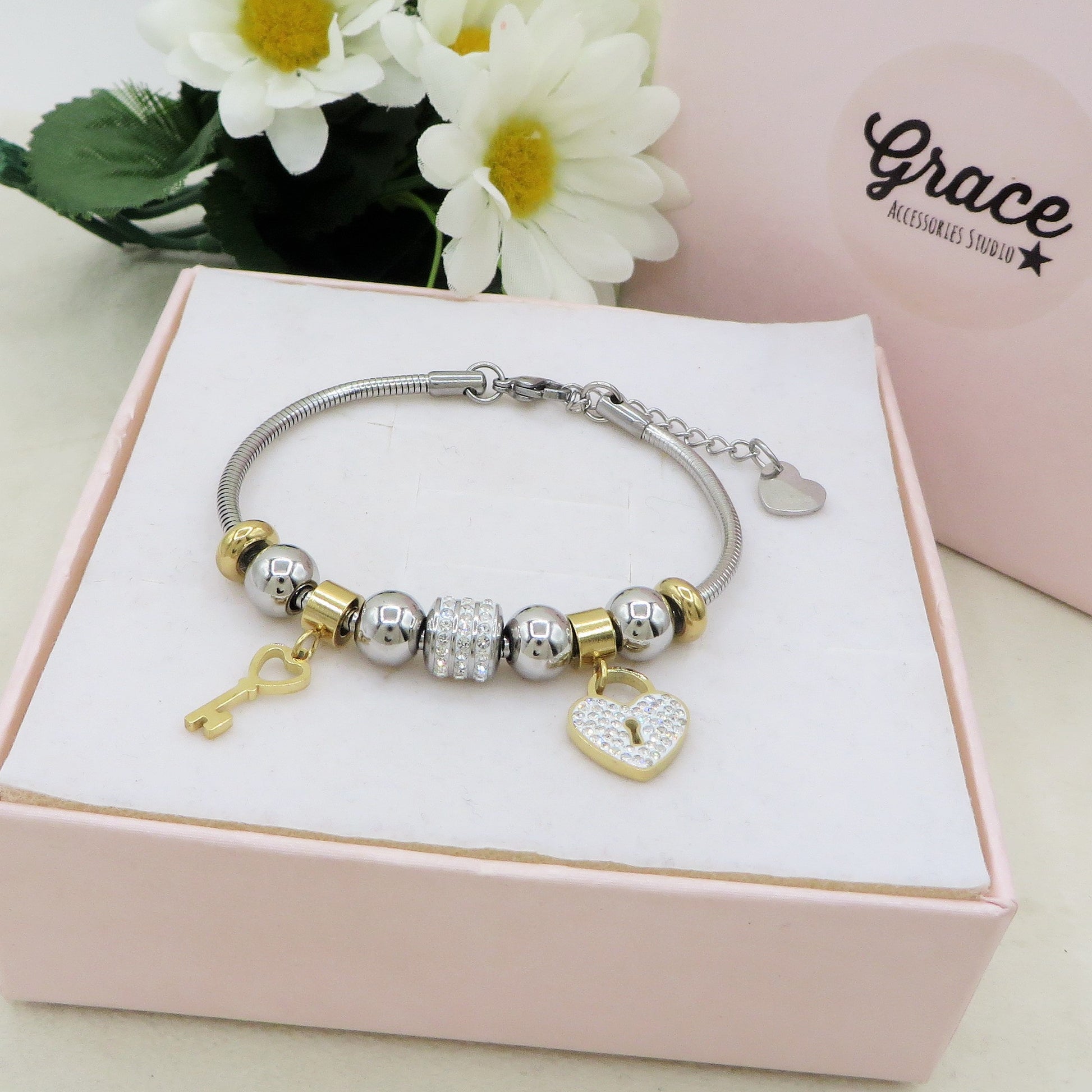 FOREVER LOVE ~ ACCIAIO INOSSIDABILE - bracciale con cuore lucchetto charms in Cubic Zirconia rotondi