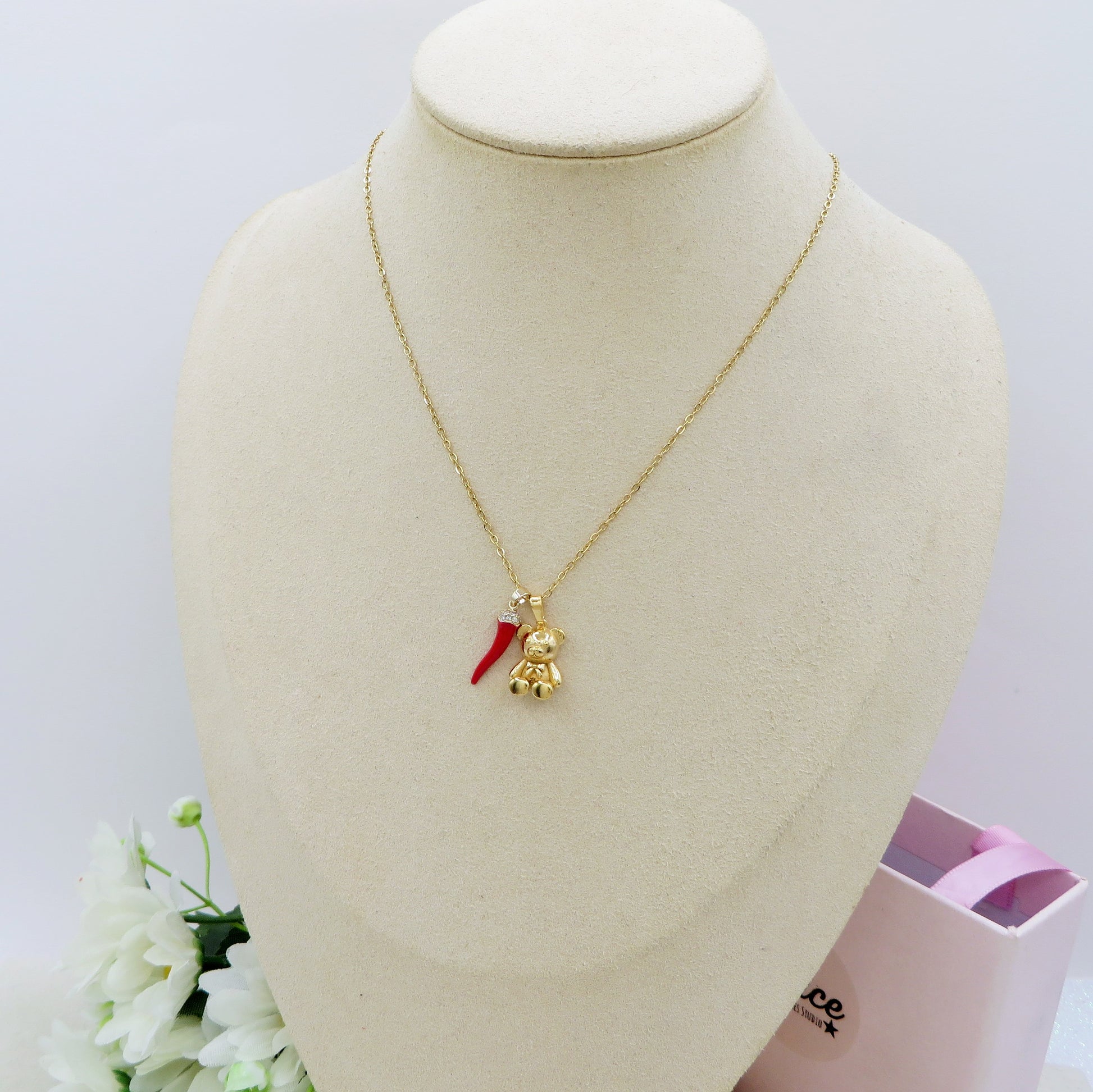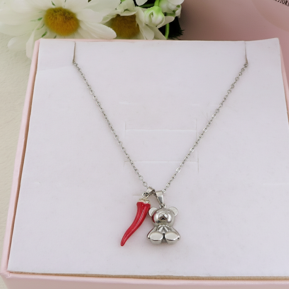 FORTUNE TEDDY - Collana teddy pendente orsetto in Acciaio inossidabile + cornetto portafortuna